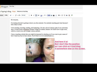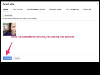 The document provides instructions for setting up a blog on blogger.com. It explains how to choose a title and template for the blog, how to write and publish blog posts, and how to add images, links, and other blogs to follow. The instructions also describe how to comment on other classmates' blogs by clicking on the comment section at the bottom of each post.