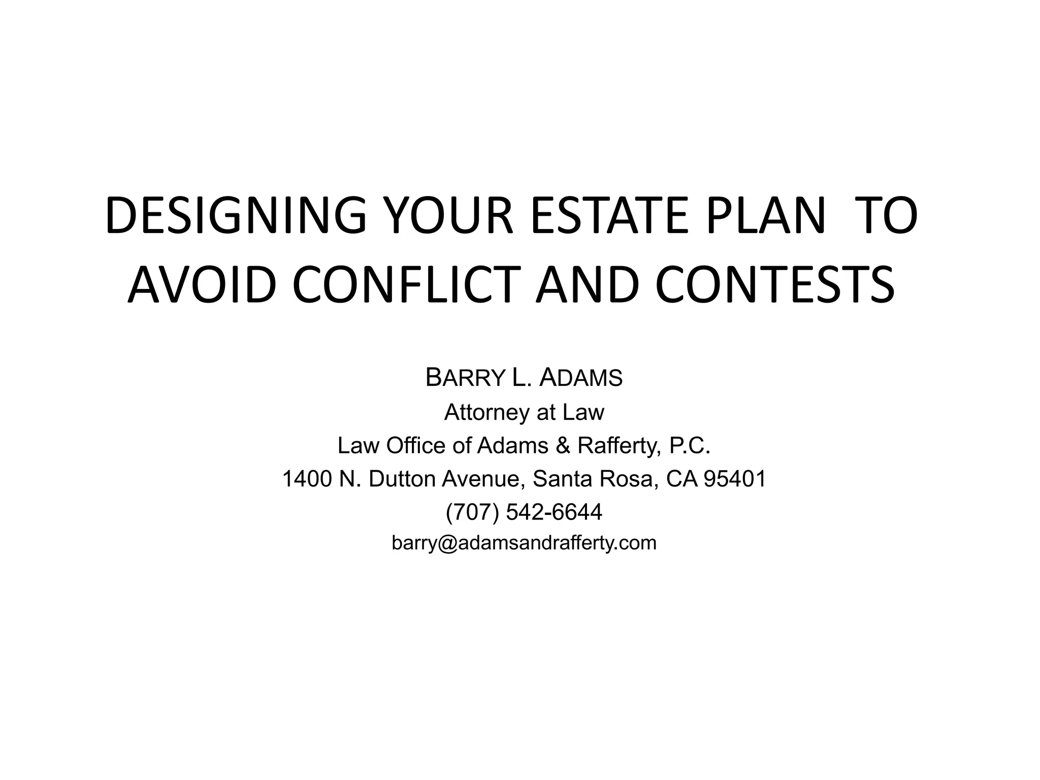 This document discusses strategies for estate planning to avoid conflicts and contests between beneficiaries. It recommends clearly communicating wishes to beneficiaries during life to prevent misunderstandings after death. The document also suggests simplifying the division of estates, carefully selecting trustees to avoid bias or conflicts of interest, including no-contest clauses, and giving trustees discretion in areas likely to cause disputes.
