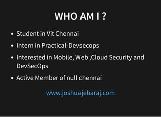 The document discusses how to set up a pentesting lab using Vagrant. Vagrant is a tool that allows users to easily manage and scale virtual development environments. It discusses what Vagrant is, why it is useful, basic Vagrant commands, understanding the Vagrantfile, and demonstrates setting up a pentesting lab with Vagrant.