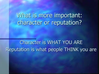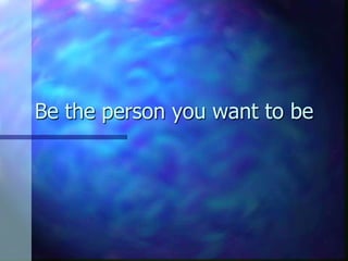 This document discusses the importance of knowing one's values in order to be the person you want to be. It provides exercises to help identify an individual's top values by imagining one's funeral and what would be said about their character. Key words from these imagined speeches can reveal core values like love, freedom and security. The document advises ranking values by importance and reflecting on what each value means in order to guide decision making and ensure one's actions align with who they aim to be.