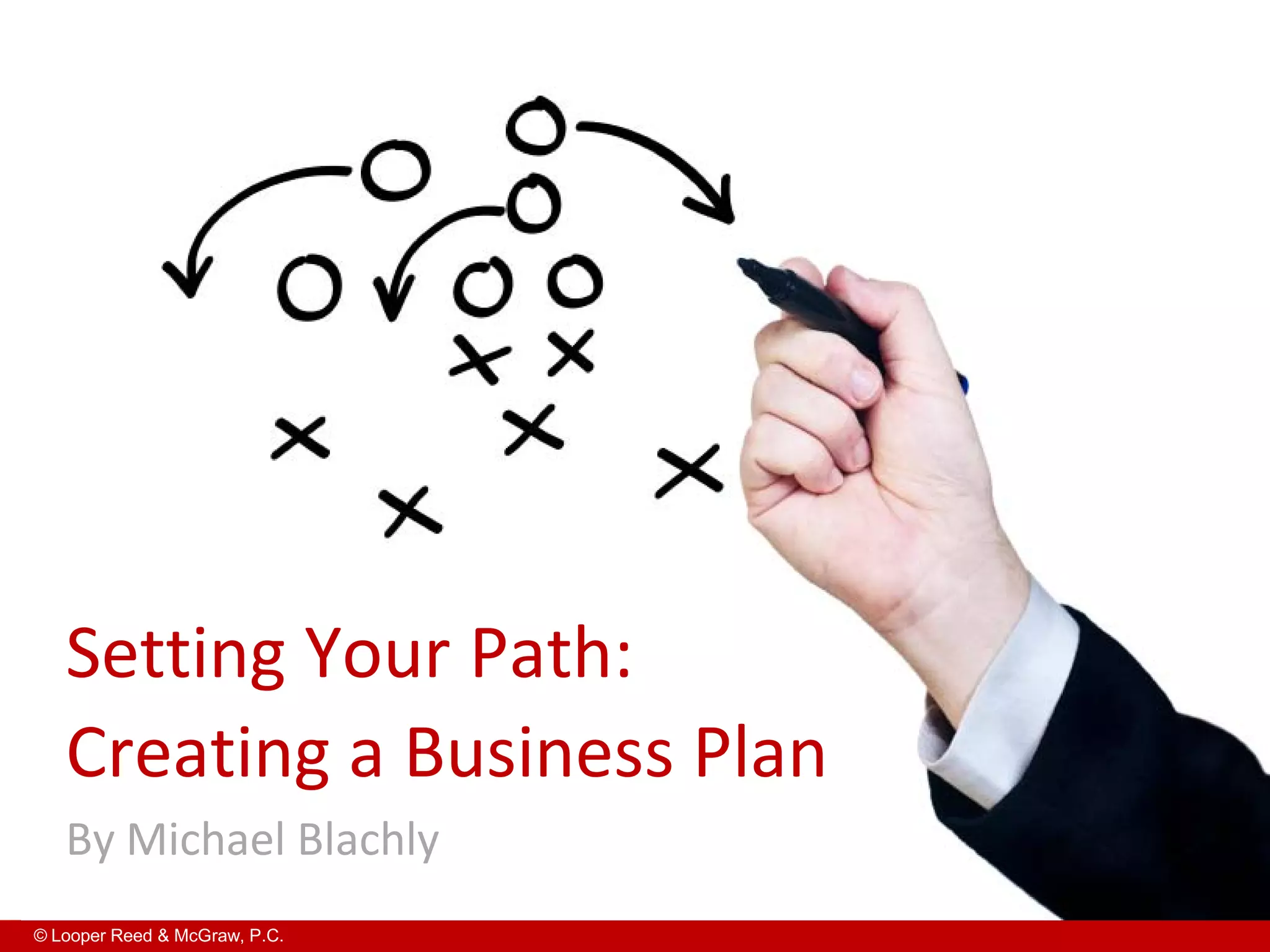 The document discusses creating an effective business plan for lawyers. It emphasizes identifying a niche practice area and market, developing relationships with referral sources, learning about prospective clients, and becoming visible in the niche community through activities like writing, speaking, and volunteering. The business plan should include goals, strategies for business development and profile building, and a budget for billable versus non-billable time allocation. Creating a 90-day action plan can help achieve business plan goals.