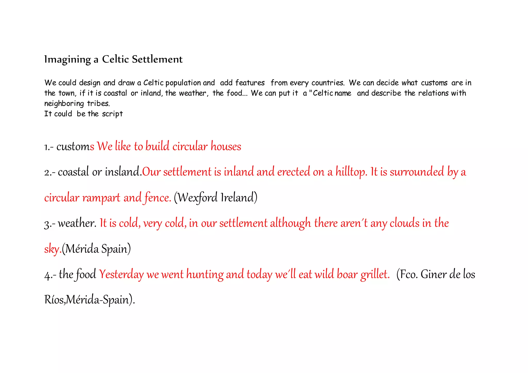 Our settlement is an inland Celtic town located on a hilltop in Wexford, Ireland surrounded by a circular rampart and fence. The town has circular houses and its inhabitants enjoy hunting wild boar, which they eat grilled despite the cold weather without clouds. The settlement is named "Celticland" and its customs involve building circular dwellings.