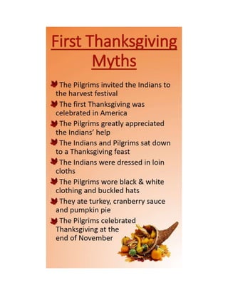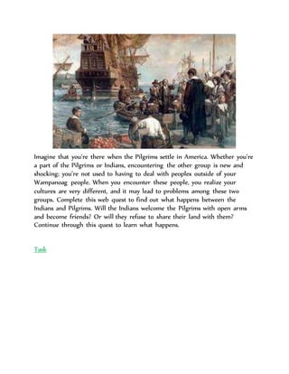 This web quest guides students through a role-playing activity to learn about the cultural differences and interactions between the Pilgrims and Wampanoag Indians when the Pilgrims first settled in America. Students will write journal entries from the perspectives of both Pilgrims and Indians. They will then work in groups to develop arguments for a class debate about the settlement. Finally, they will create a script and film reenacting the Pilgrims' settlement that accurately portrays the cultural encounter between the two groups. The goal is for students to separate historical myth from fact about the Pilgrims and their relationship with the native Wampanoag people.