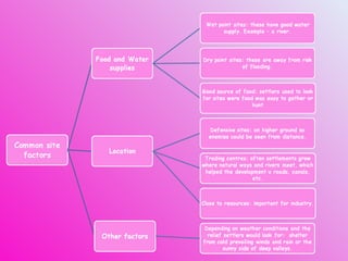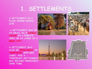 The document discusses different types of settlements and urban models. It defines a settlement as a place where people live, from a single house to a large city. Settlement sites are chosen based on factors like proximity to water and transport routes. Larger settlements become hierarchical centers that provide more services. Urban models in more economically developed countries include concentric zones like the central business district and suburbs. Models in less economically developed countries have informal shanty towns and greater inequality. The document also discusses problems of urbanization like congestion and ways to make cities more sustainable.