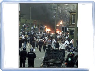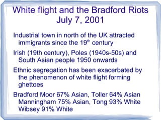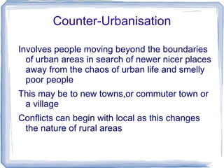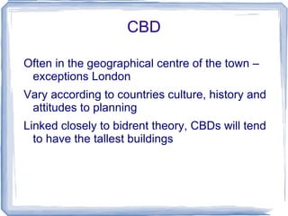 The document discusses the central business district (CBD) and issues related to urban planning. It notes that the CBD is often in the center of town and has the tallest buildings. It contains department stores, offices, transportation hubs, and government buildings. Traffic congestion is worst in the CBD due to high density. The document also discusses white flight and ethnic segregation in Bradford, UK. It led to the formation of neighborhoods with high concentrations of certain ethnic groups. The phenomenon of counter-urbanization is described as people moving from urban to suburban or rural areas to escape chaos and pollution in cities.