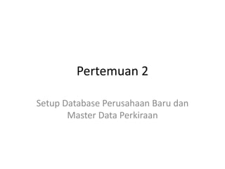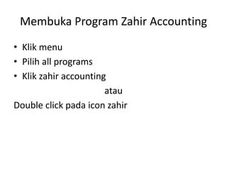 Dokumen ini menjelaskan langkah-langkah untuk mengatur database perusahaan baru menggunakan program Zahir Accounting, termasuk pembuatan data perusahaan, pemilihan periode akuntansi, dan penambahan akun. Prosedur mencakup pengisian informasi perusahaan, konfirmasi data, serta pembuatan dan pengelolaan daftar akun. Pengguna juga dapat mengedit atau menghapus akun dalam daftar yang telah dibuat.