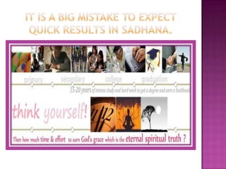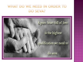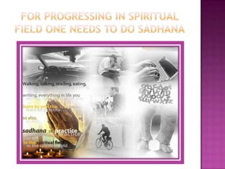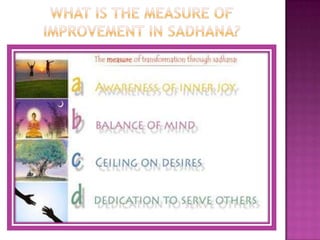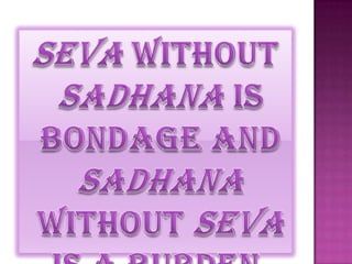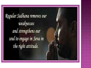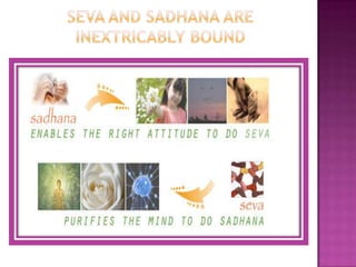 This document discusses the importance of sadhana (spiritual practice) and seva (selfless service). It states that while seva is a form of sadhana, regular spiritual practice is needed to cultivate the selfless attitude required for true service. Sadhana promotes an attitude of servitude and helps remove selfish desires through establishing communion with God within. It should result in inner joy, mental balance, control of senses and dedication to serving others. Both sadhana and seva are essential for spiritual progress and fulfilling the purpose of human life.