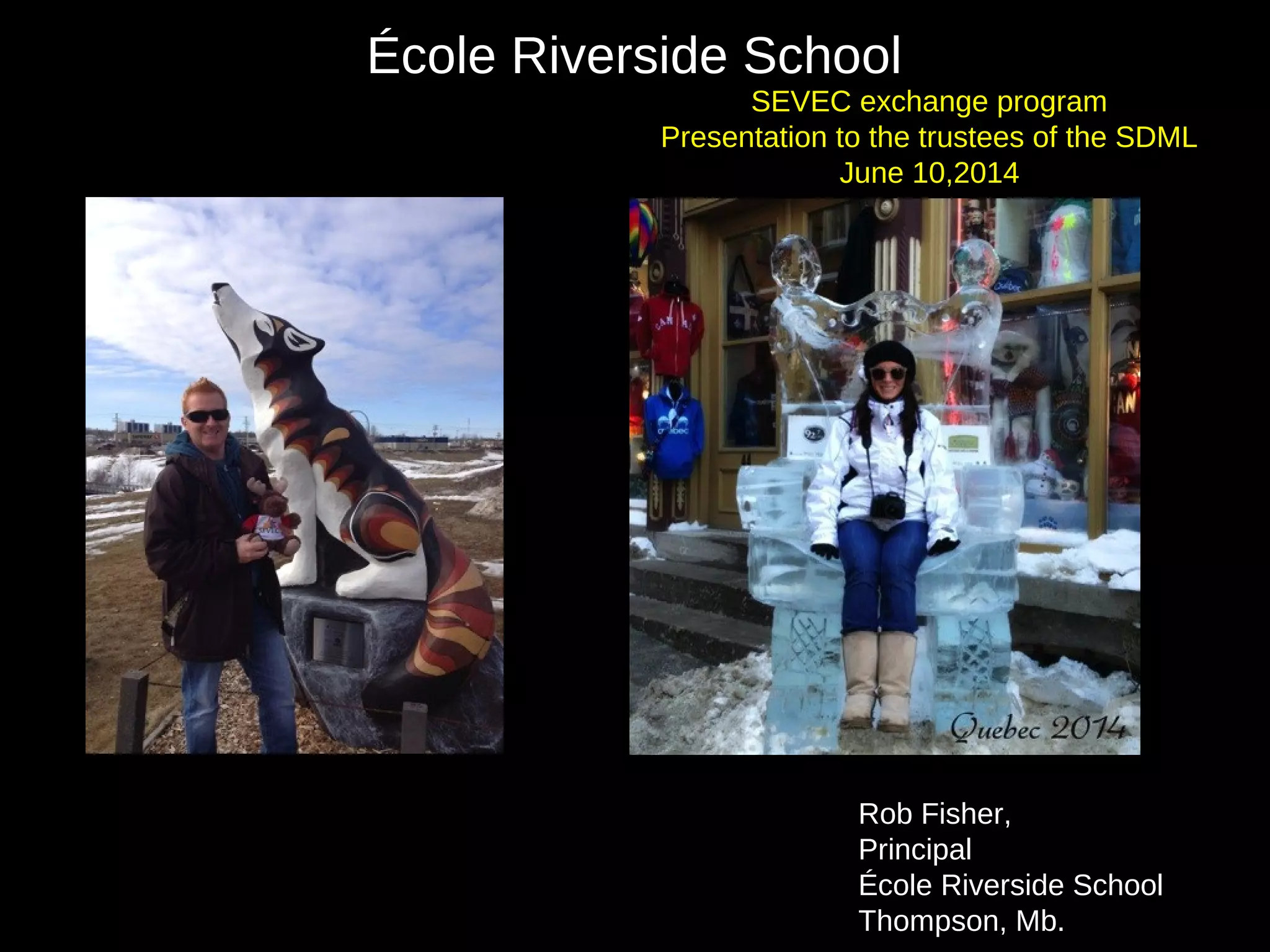 1) Rob Fisher, the principal of École Riverside School, gave a presentation to the trustees of the SDML on June 10, 2014 about the school's SEVEC exchange program.