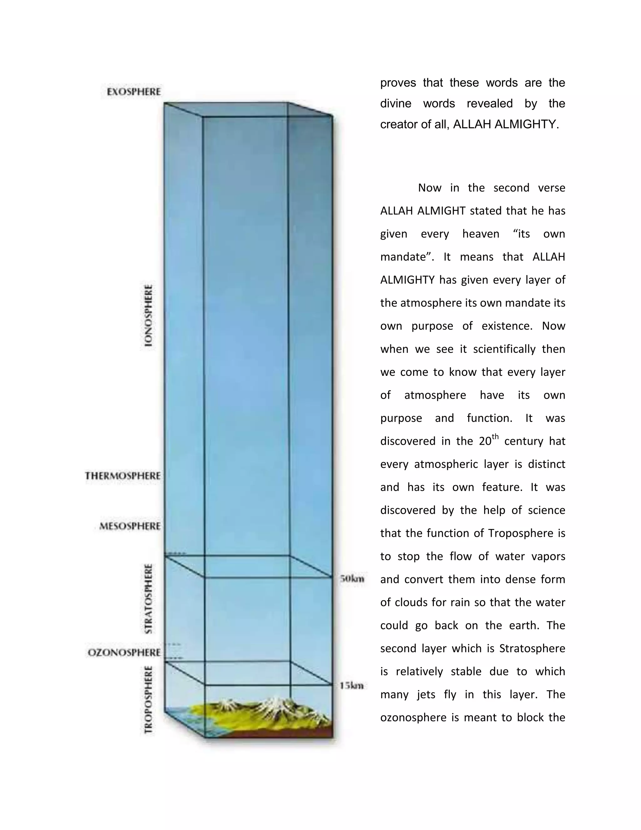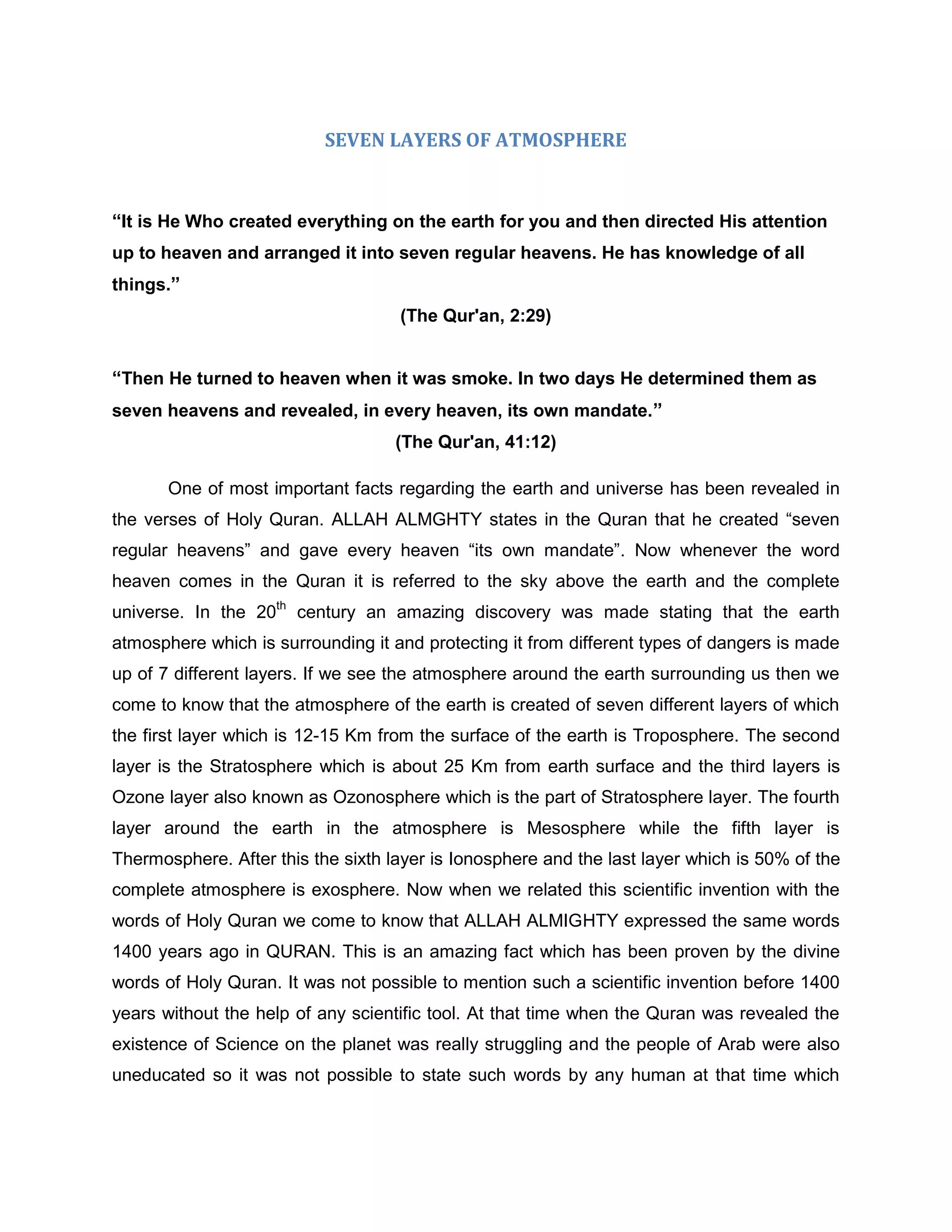 The document discusses how the Quran described the seven layers of the earth's atmosphere over 1400 years ago, long before the layers were discovered by science in the 20th century. The Quran states that Allah "created everything on the earth for you and then directed His attention up to heaven and arranged it into seven regular heavens" and that "He has knowledge of all things." It also says that Allah "turned to heaven when it was smoke. In two days He determined them as seven heavens and revealed, in every heaven, its own mandate." Modern science has since discovered that the earth's atmosphere is made up of seven distinct layers, each with its own purpose, matching what was described in the Quran. This shows that