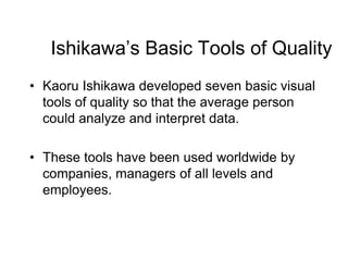 The document discusses the seven quality tools developed by Kaoru Ishikawa: histograms, Pareto charts, cause and effect diagrams, run charts, scatter diagrams, flow charts, and control charts. It provides descriptions and examples of how to construct and use each tool, including slides explaining histograms, Pareto charts, cause and effect diagrams, scatter diagrams, run charts, flow charts, and control charts. The tools are visual aids to analyze processes, identify problems, determine relationships between variables, and monitor quality.