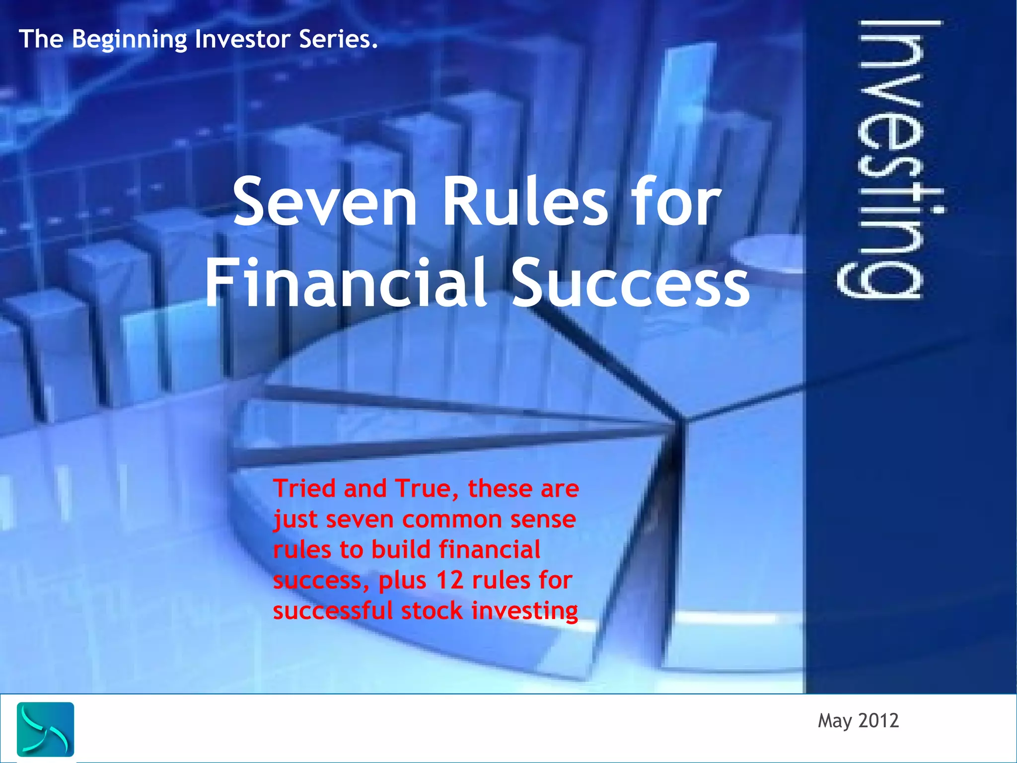 The document outlines seven fundamental rules for financial success aimed at beginner investors, emphasizing debt management, saving strategies, and effective investing techniques. It also includes 12 specific rules for stock investing, focusing on establishing a financial foundation, maximizing retirement contributions, and investing in high-quality companies. Additionally, it serves as a guide to understanding financial markets and encourages individuals to take charge of their financial futures.