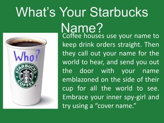 The document provides seven simple safety suggestions. The suggestions include using a cover name when ordering coffee to maintain anonymity, staying physically fit to increase safety abilities, being aware of one's surroundings for effective self defense, proper use of pepper spray for better control and accuracy, only sharing location information on social media after visiting a place rather than while there, a website for sharing online harassment concerns, and knowing safe havens to access if feeling threatened while traveling or out.