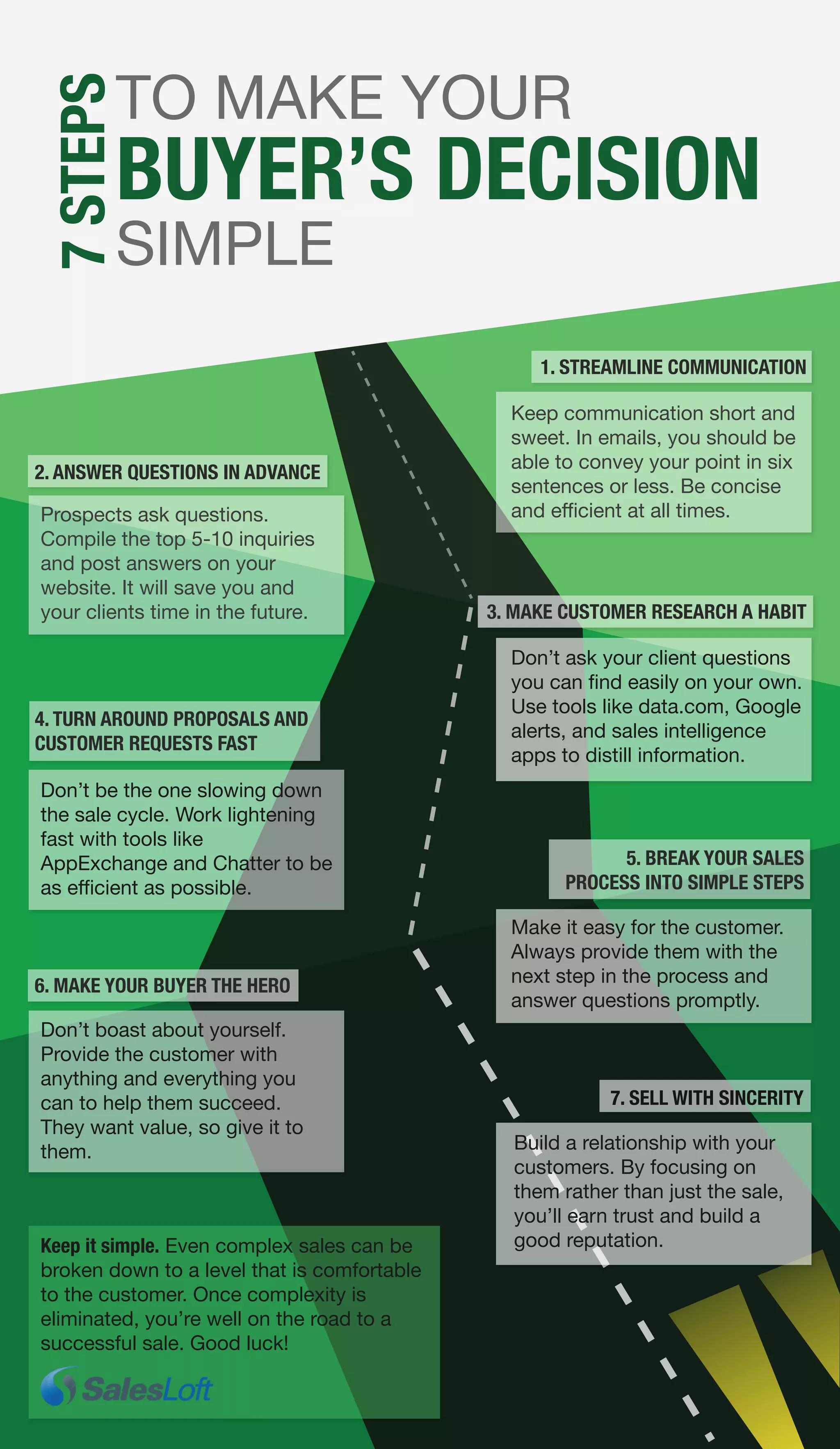 This document provides 7 steps to simplify a buyer's decision-making process: 1) streamline communication by keeping emails concise, 2) answer common questions on your website in advance, 3) do customer research proactively using online tools, 4) turnaround proposals and requests quickly using tools like AppExchange and Chatter, 5) break the sales process into simple steps and clearly outline the next step, 6) position the customer as the hero by providing value and helping them succeed, 7) sell with sincerity by building relationships and focusing on customers rather than just making the sale. The overall goal is to eliminate complexity and make the sales process comfortable for the customer.