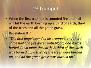 The document summarizes the events that will occur according to the Book of Revelation when each of the seven trumpets are sounded. The first six trumpets will cause destruction on earth through fire, hail, meteor impacts affecting the seas and rivers, and darkness. The fifth trumpet will see the release of locusts that torment people. The sixth trumpet will release a demonic army that kills one third of mankind. The seventh trumpet signals seven angels pouring out bowls of God's wrath.