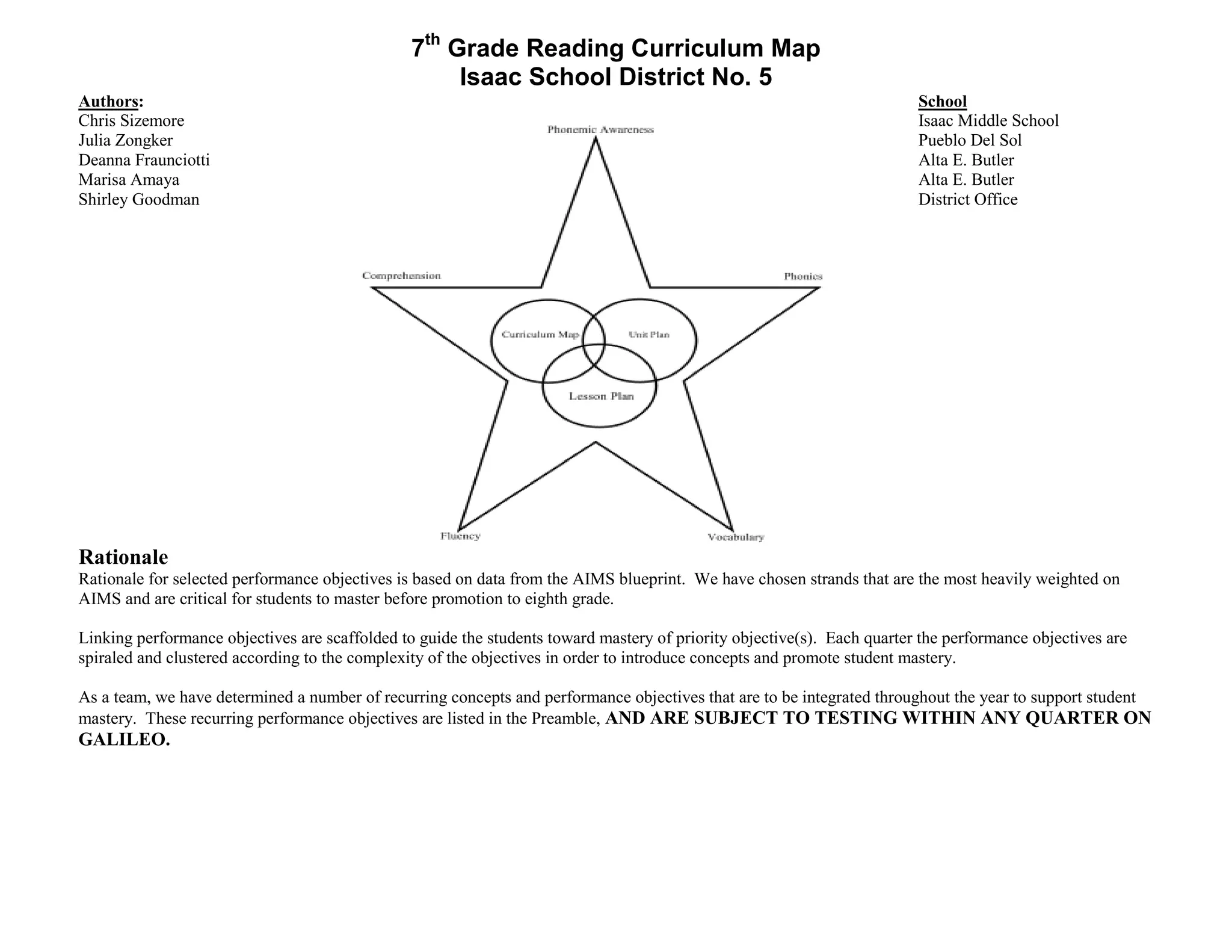 This document provides a curriculum map for 7th grade reading at the Isaac School District. It was authored by five teachers from schools within the district as well as someone from the district office. The map outlines performance objectives and essential learnings for four quarters of instruction organized into units. It identifies key vocabulary, comprehension strategies, and summative assessments. Recurring concepts and objectives are listed in the preamble and will be integrated throughout the year, subject to testing on Galileo.