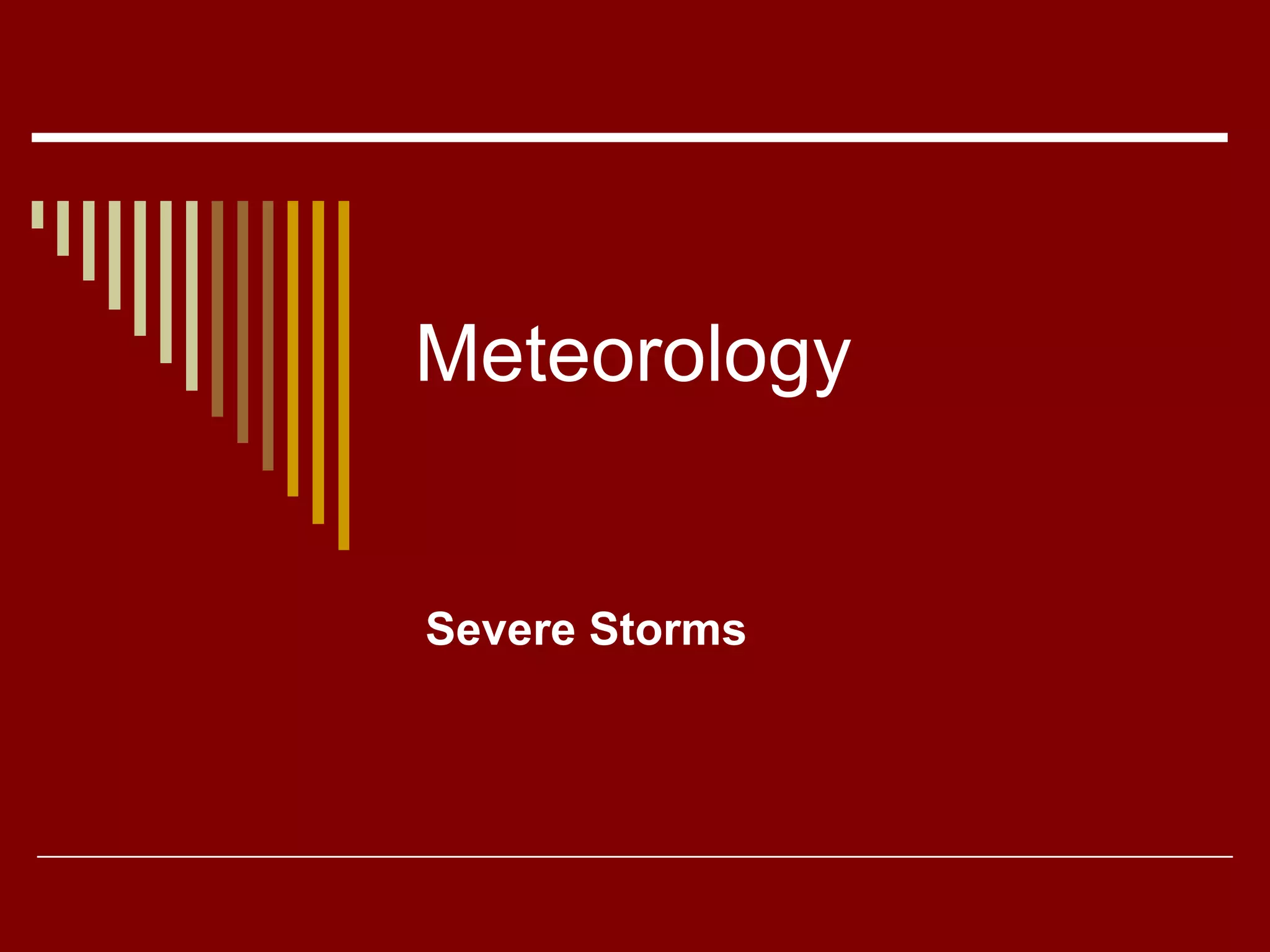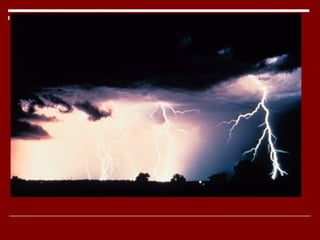 Thunderstorms are common storms that produce lightning and thunder through heating of the air. They form in three stages - air rises to form clouds, moisture falls as rain or hail when clouds can no longer hold it, and static electricity builds from air moving in opposite directions causing lightning. Thunderstorms usually form ahead of cold fronts in warm air and can sometimes spawn tornadoes in areas where warm, moist air meets cold, dry air masses like the Great Plains and Mississippi Valley.
