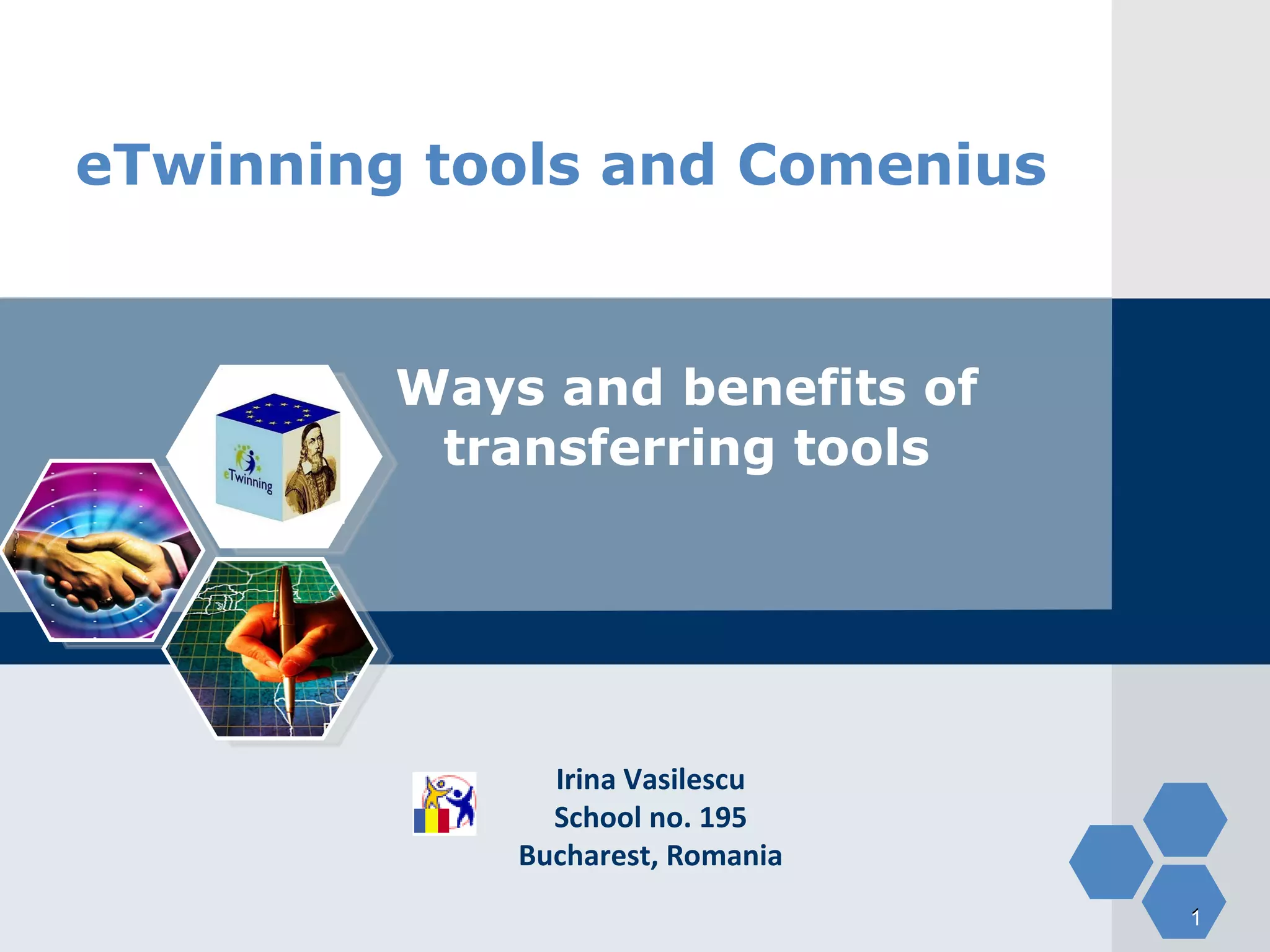 This document discusses the roles and benefits of using eTwinning tools in Comenius partnerships and vice versa. It provides suggestions for using eTwinning tools like the portal, desktop, Twinblog, and TwinSpace in Comenius projects for communication, partner finding, planning, organizing, disseminating work, and follow up. It also discusses how Comenius tools like support from the local community and face-to-face activities can benefit eTwinning projects. Finally, it recommends diversifying projects using external tools from websites like Glogster and Magazine Factory to keep the human mind open.