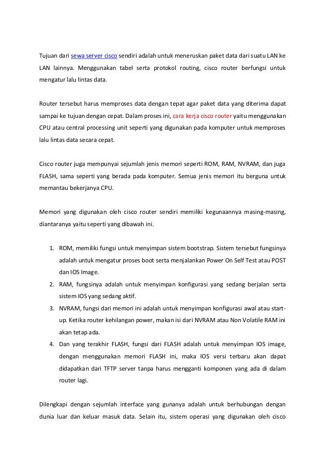 Cisco adalah perusahaan teknologi yang mengembangkan alat untuk jaringan, termasuk router yang digunakan untuk meneruskan data antar jaringan. Banyak orang menyewa server Cisco untuk kecepatan dan efisiensi dalam pengelolaan lalu lintas data menggunakan protokol routing. Cisco Packet Tracer memungkinkan pengguna untuk belajar dan mempraktikkan konfigurasi jaringan dengan mudah, mendorong keterampilan dalam pengoperasian alat jaringan.