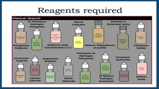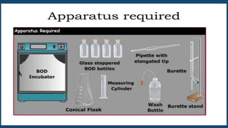The document discusses the biochemical oxygen demand (BOD) method for determining sewage quality. It defines BOD as the amount of dissolved oxygen needed by organisms to break down organic material in water. The most common BOD test is the 5-day BOD (BOD5) test, which measures the oxygen demand over a 5-day incubation period at 20°C. Elevated BOD levels can be caused by human/animal waste, fertilizer runoff, and higher water temperatures that increase plant growth. The document outlines the detailed procedures for conducting the BOD5 test and analyzing the results. It notes advantages of the test being simple and widely used but disadvantages include its long incubation period and susceptibility to inhibition.