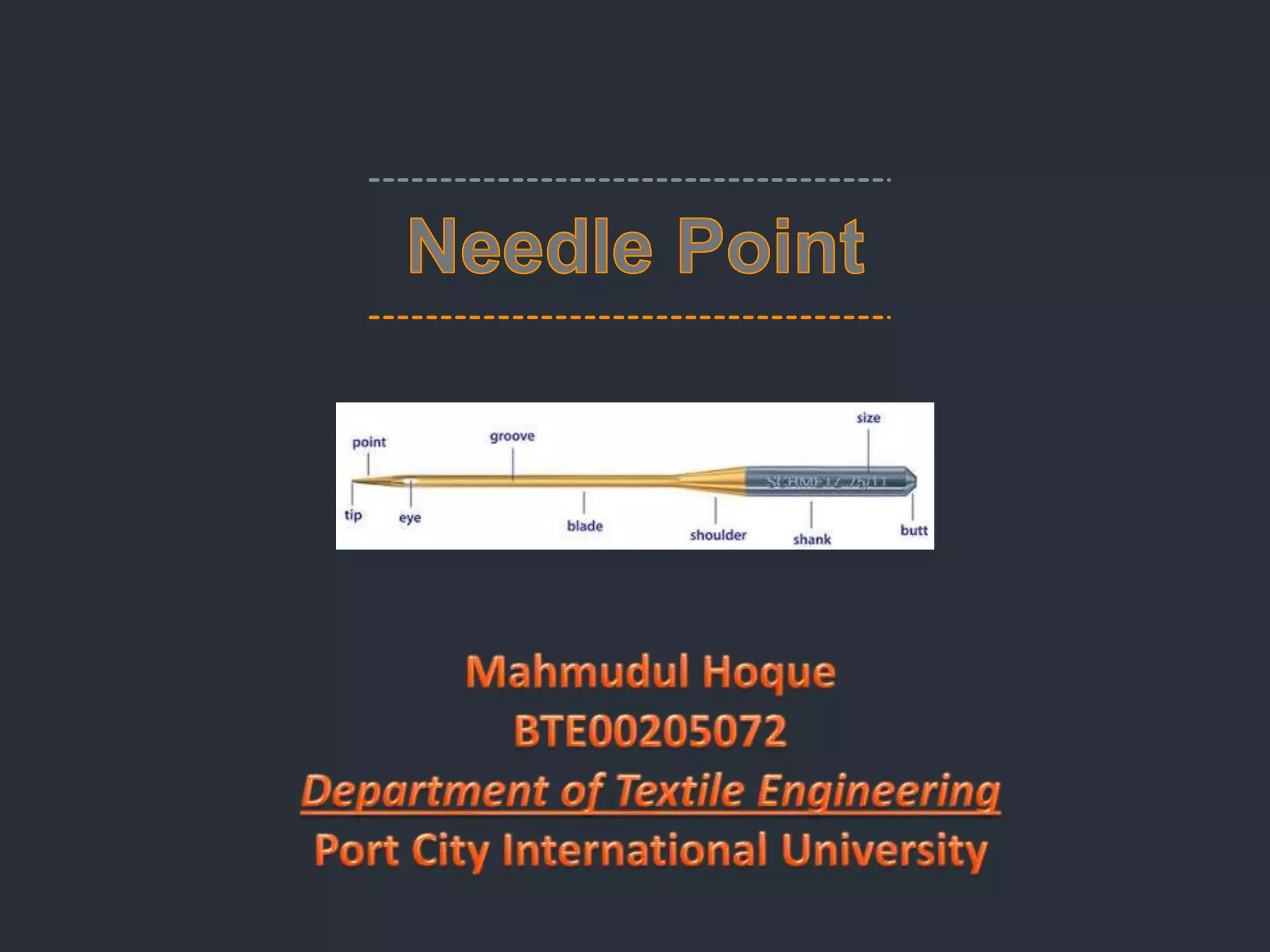 Needle points are classified into two main types: round (set or cloth point, ball point) and cutting (leather point, including wedge, cross, and twist points). Cutting points are suited for sheet materials like plastic and leather, as they create sufficient holes for thread to pass through. Each point has specific characteristics designed for different materials and applications, including stitch density and decoration techniques.