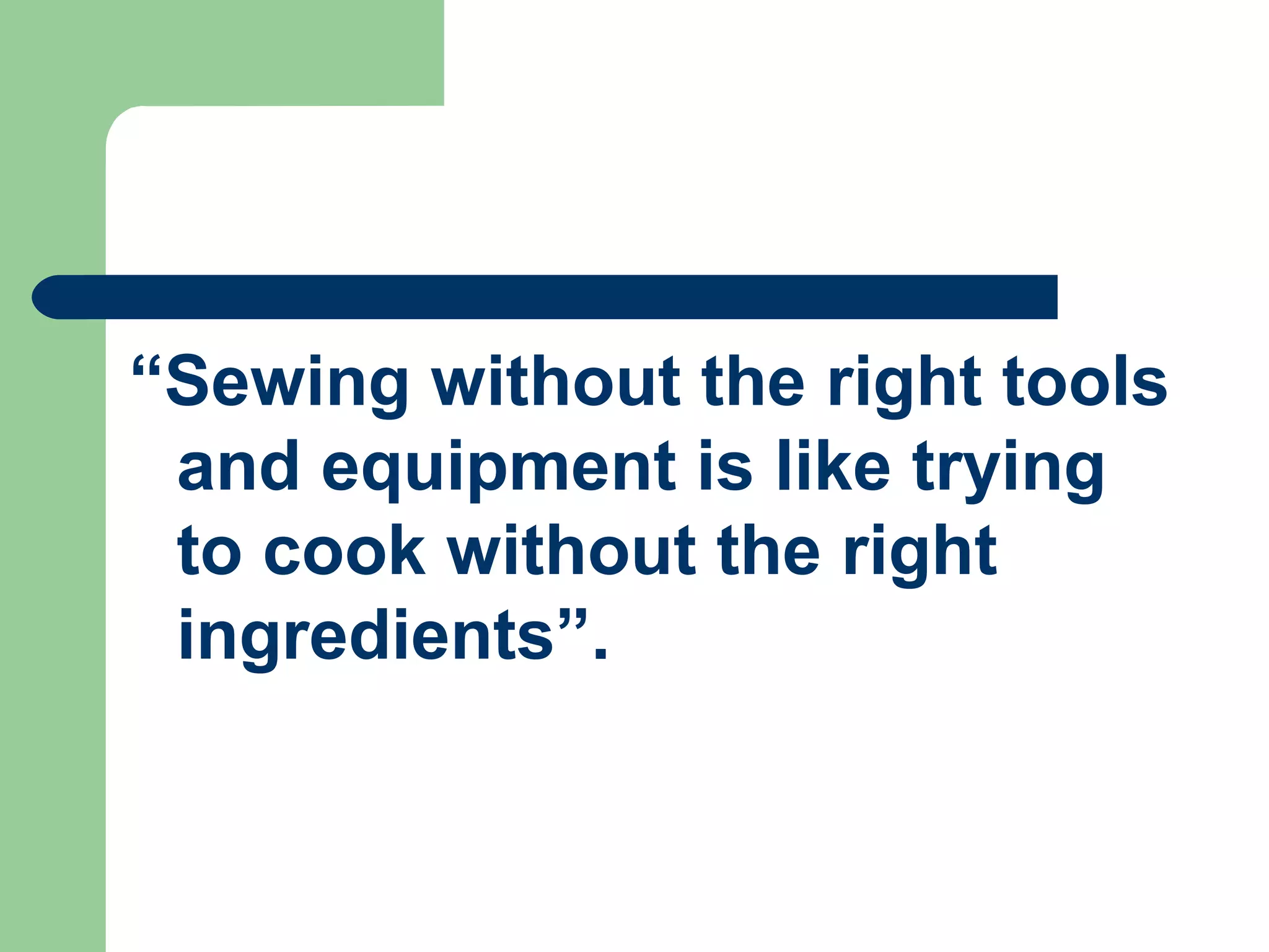 This document provides information about various sewing tools and equipment, their classification, and uses. It discusses different types of measuring tools like tape measures and rulers, cutting tools like shears and seam rippers, marking tools like chalk and pens, and pinning tools like thimbles. It also lists common sewing tools under each category and provides details about their purposes. For example, it states that bent-handled dressmaker's shears are used for cutting fabrics and seam rippers are used for removing stitches. The document aims to educate about proper tool selection and application for sewing tasks.