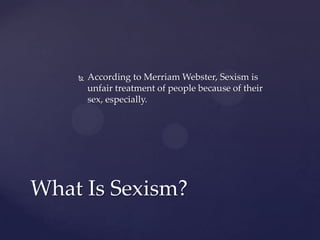 Sexism is unfair treatment or discrimination against people based on their sex or gender. It often stems from harmful gender stereotypes that see women as inferior. Throughout history, women have faced discrimination and been seen as witches or less capable. While sexism exists in many societies, the document notes it can be particularly problematic in Guatemala where women face wage gaps and judgment based on their appearance or culture. Several contributors reflect that sexism damages society by limiting women's opportunities and that change needs to start at home by teaching children respect regardless of gender.
