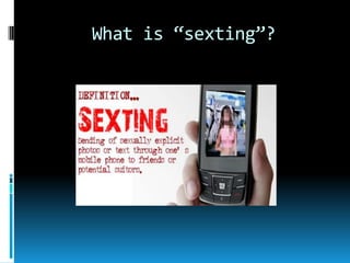 This document discusses the issue of sexting among teens. It begins by defining sexting and noting that some teens have faced sex offender registration for accidentally receiving inappropriate pictures. While sexting carries risks, the legal consequences have become less severe in some cases since 2013 than automatic sex offender registration. The document cites a study that found 39% of US teens have received sexually suggestive texts or emails, and it notes that 40% of such content is unintended for the recipient. It closes by providing statistics that females are more likely than males to have sent naked photos or videos of themselves.