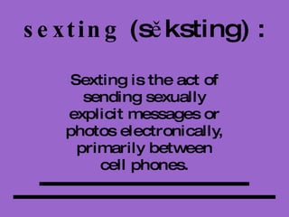 Sexting, the act of sending sexually explicit messages or photos electronically, has become a problem among teens. While some teens view it as harmless flirting, it can have serious emotional consequences if the images are shared further, such as bullying, depression, and in some cases suicide. Current sexting laws punish offenders with felony charges and sex offender registry, but legislators are considering reducing charges to misdemeanors for teen sexting to avoid severe lifelong consequences. Educating teens on the risks and changing the laws are proposed as solutions.