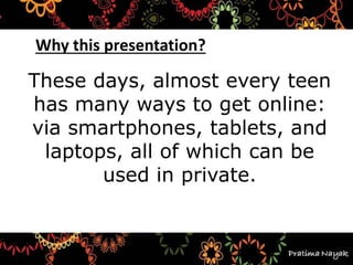 The document discusses the prevalence and risks of sexting among teens, highlighting that many teens engage in this behavior due to peer pressure, attention-seeking, or as a norm. It warns that once private messages or images are shared, they are no longer under the sender's control and can have lasting consequences, including humiliation and legal issues. Parents are encouraged to foster open communication and teach their children about personal responsibility and privacy to mitigate these risks.