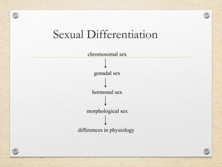Sexual differentiation in humans occurs through a multi-step process determined by chromosomal, gonadal, hormonal, and morphological sex. The presence or absence of the SRY gene on the Y chromosome triggers testis or ovary development from the initially undifferentiated gonad. The testes secrete testosterone and Müllerian inhibiting hormone which masculinize the internal and external genitalia as well as the brain, preventing female development. In the absence of these hormones, the individual develops along female lines. Disorders can occur at each stage of differentiation, resulting in intersex conditions or abnormalities in sexual development.