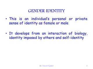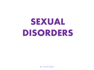 The document discusses various topics related to sexual health including gender identity, gender roles, transsexualism, paraphilias, sexual addiction, sexual dysfunctions, nursing care for sexual dysfunctions, and sex therapy. It defines key terms and describes characteristics and treatment approaches for various conditions. The overall purpose is to provide information on these topics to healthcare providers.
