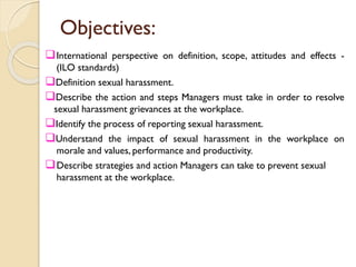 The document discusses sexual harassment in the workplace and provides guidance for managers. It defines sexual harassment and outlines behaviors that constitute it, such as unwelcome physical, verbal, and non-verbal conduct of a sexual nature. Sexual harassment can occur between any combination of colleagues, customers, and visitors in various locations at work. The document advises managers to prevent sexual harassment, address complaints confidentially, and understand the serious psychological and organizational effects it can cause like decreased productivity. It stresses the responsibility of managers to ensure a safe work environment and handle issues properly according to company policy.