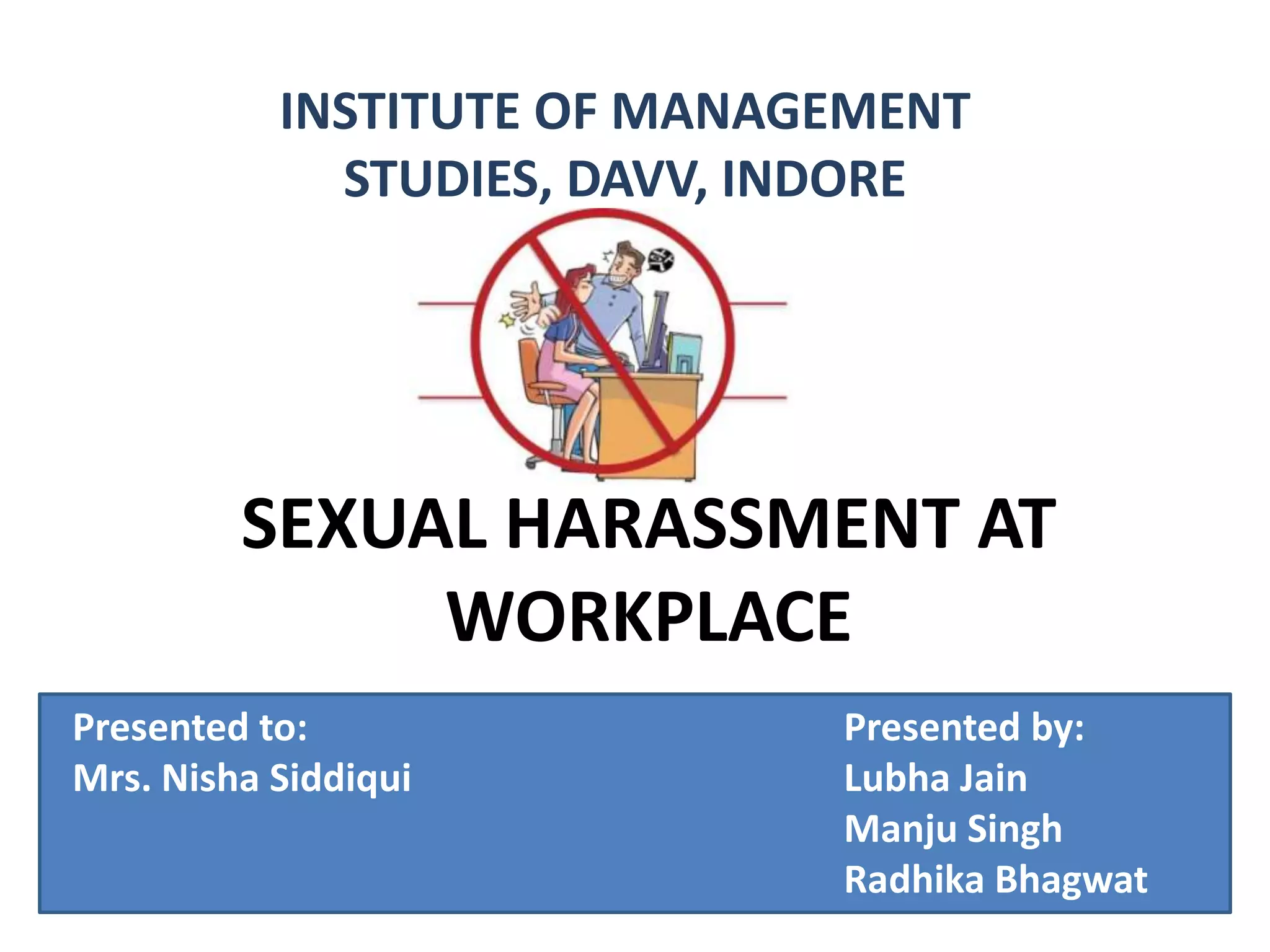 The document summarizes Indian laws and guidelines around sexual harassment at workplaces. It discusses the Vishaka Guidelines established by the Supreme Court in 1997 that made preventing and addressing sexual harassment an employer's duty. It also outlines the Sexual Harassment of Women at Workplace Act of 2013, which provides a framework for internal complaints committees, local complaints committees, grievance procedures, duties of employers, and penalties for non-compliance. The act aims to protect women's fundamental rights to equality, life with dignity, and a safe work environment free from sexual harassment.