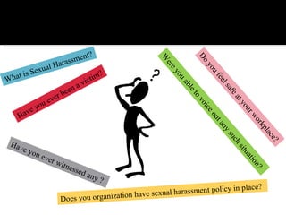 Sexual harassment at the workplace remains a serious problem, with studies finding that 40-90% of women have experienced some form of it. It includes unwelcome sexual behavior that creates a hostile environment. While laws and guidelines exist, many victims still do not report it due to fear and lack of awareness of policies and support structures. Continued efforts are needed to address the issue and protect worker rights and dignity.