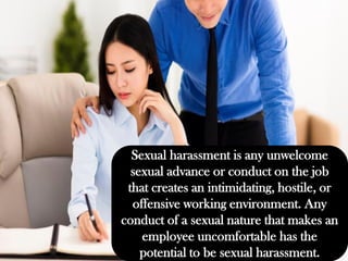 Sexual harassment in the workplace involves unwanted sexual advances that create a hostile environment and is illegal due to violations of victims' rights. Contributing factors include power dynamics, emotional distress, and societal attitudes that blame victims. Effective prevention requires clear policies, employee training, and proactive monitoring by management.