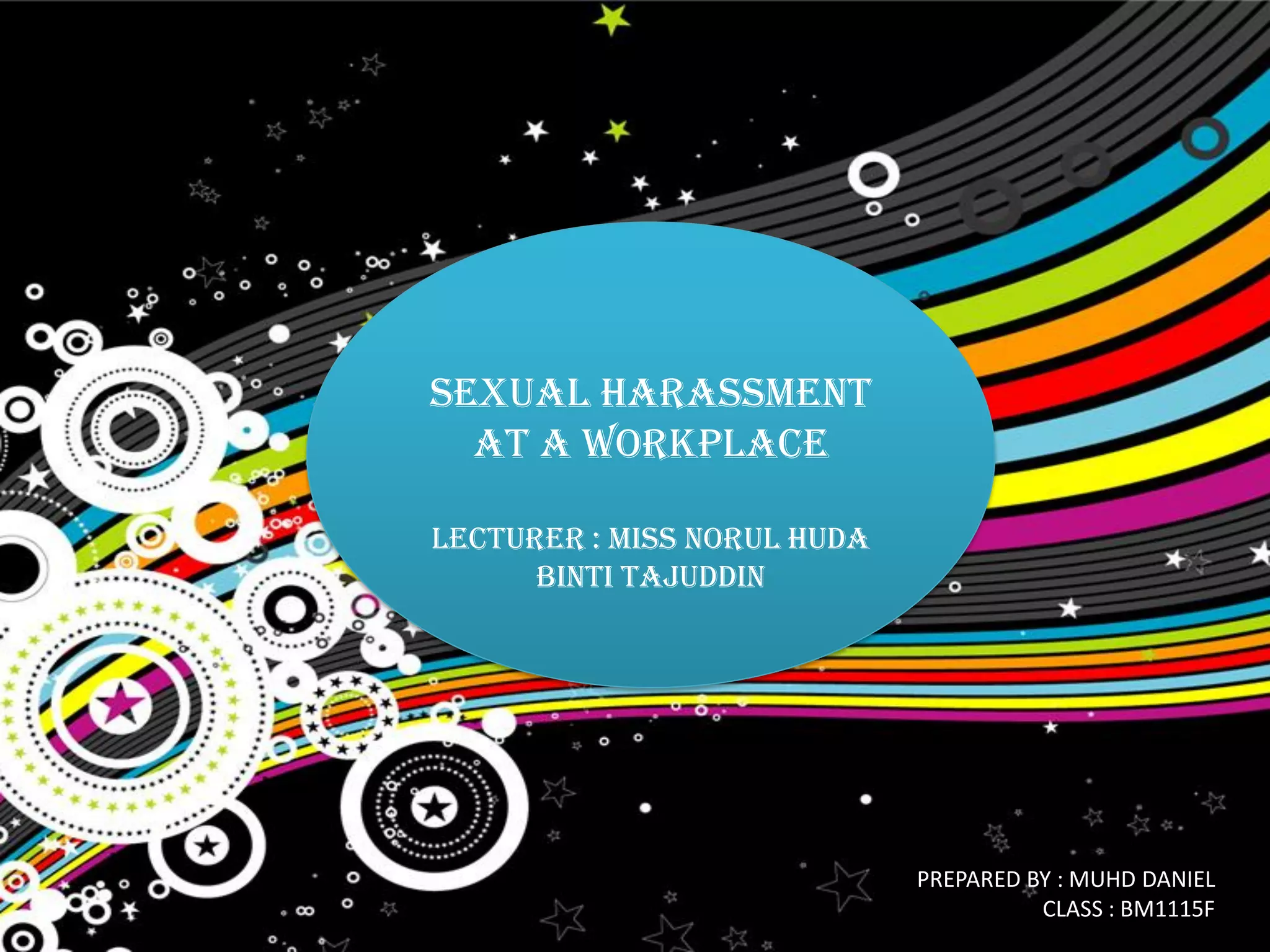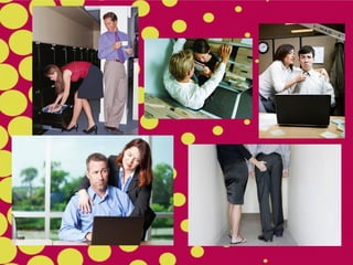 Sexual harassment in the workplace is illegal and unacceptable. It undermines people's ability to work and feel empowered. There are various causes of sexual harassment, including socialization and power dynamics. Some men think women view harassment as a compliment. Harassment can take different forms, from excessive compliments to demanding sexual favors in exchange for benefits. Employers should adopt clear anti-harassment policies, train employees and supervisors, monitor the workplace, and take all complaints seriously to prevent sexual harassment. While perceptions vary, harassment is more likely when there is a power imbalance and can negatively impact victims in the short and long term.
