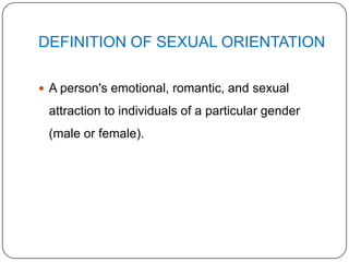 Sexual orientation involves a person's emotional, romantic, and sexual attraction to individuals of a particular gender. It is divided into three main categories: heterosexual orientation referring to attraction to the opposite sex; homosexual orientation referring to attraction to the same sex, including gay (male-male attraction) and lesbian (female-female attraction); and bisexual orientation referring to attraction to both males and females. While the exact causes are unclear, most research indicates that sexual orientation is not a choice and that both biological/genetic factors and social environment play complex roles in determining a person's orientation. Issues related to sexual orientation include homophobia, discrimination against LGBT individuals, and the recognition of same-sex families and relationships.