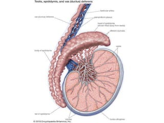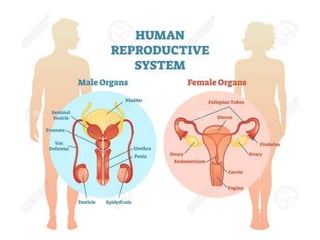 The document provides an overview of the male and female reproductive systems. It describes the key organs in both systems, including their functions and how they work together in processes like sperm production, ovulation, fertilization, and pregnancy. For the male system it covers the testes, penis, scrotum, seminal vesicles, prostate and their roles. For the female it discusses the ovaries, fallopian tubes, uterus, vagina, and mammary glands. Hormonal regulation is also summarized for both reproductive cycles.