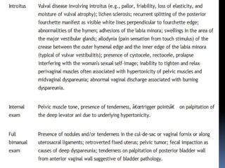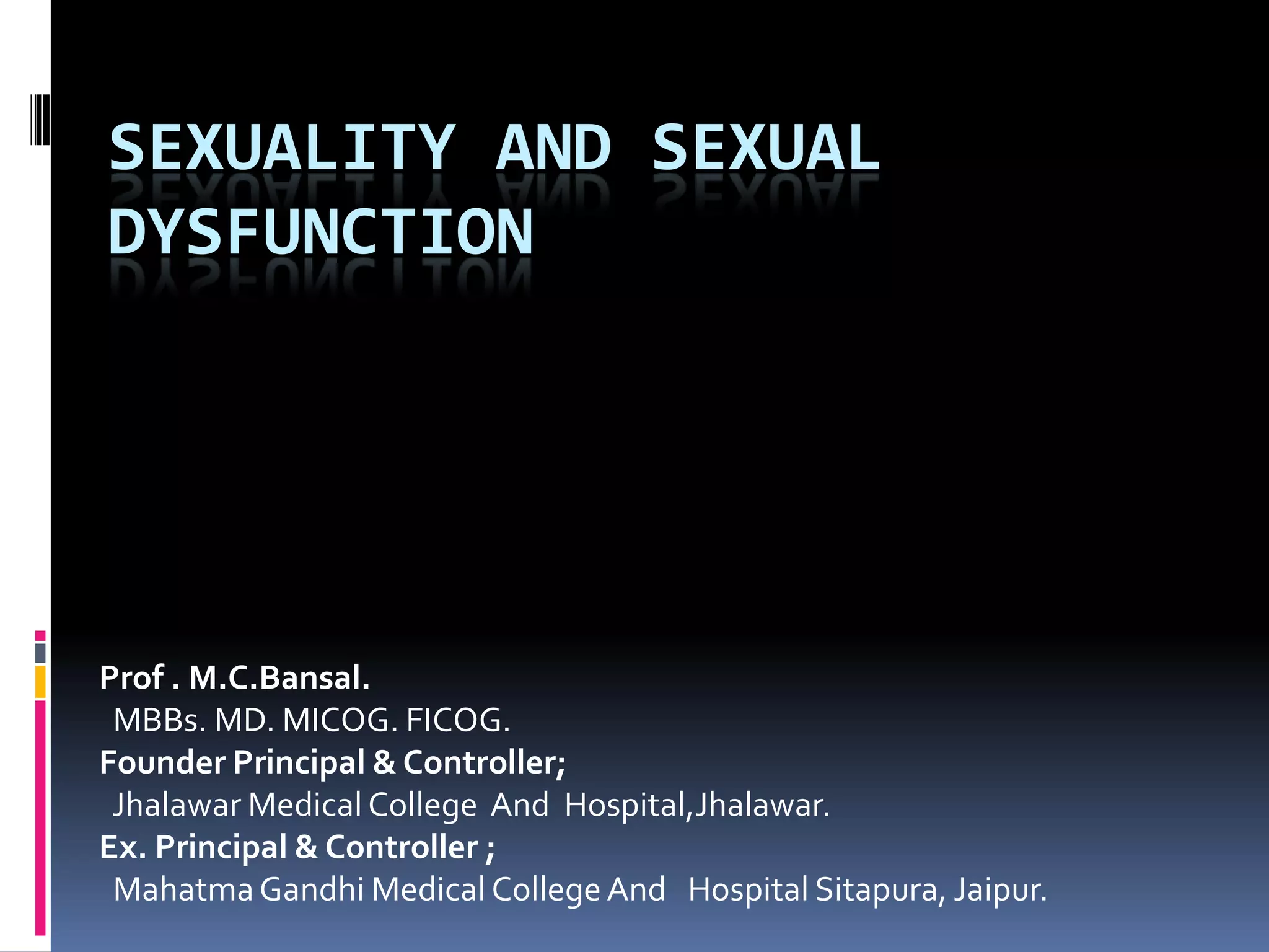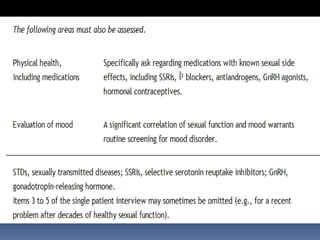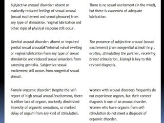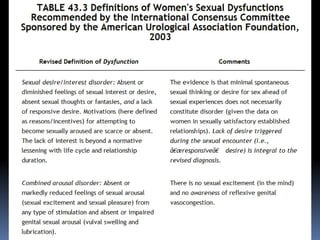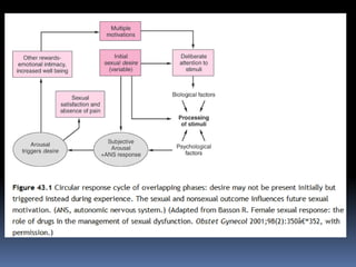 This document discusses sexuality and sexual dysfunction. It begins by defining sexuality as the right to pursue a satisfying and safe sexual life. It then discusses factors that modulate women's sexual function, including hormones, neurotransmitters, and environmental and neuroendocrine interactions. It provides models of women's sexual response cycles and discusses desire, arousal, and orgasm. It also discusses various medical conditions and psychological factors that can influence sexual function and cause sexual dysfunctions in women. The document recommends treatment approaches such as sex education, psychotherapy, medical treatments, and lifestyle modifications to address female sexual dysfunctions.
