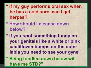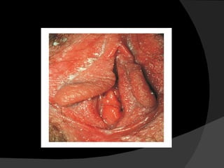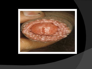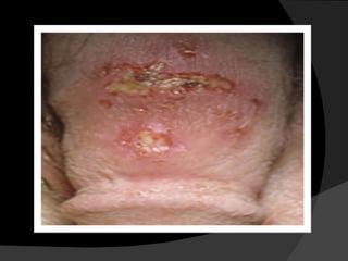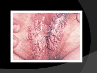 The document discusses several sexually transmitted infections including their causes, signs and symptoms, transmission, complications, treatment, and nursing interventions. Some key infections covered are gonorrhea, syphilis, chlamydia, herpes, bacterial vaginosis, candidiasis, trichomoniasis, genital warts, and HIV/AIDS. Nursing focuses on health education, screening, treatment, preventing transmission, promoting comfort, and psychological support of infected patients.
