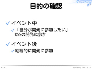 Rabbit 2.1.7 目的の確認 イベント中 「自分が開発に参加したい」 OSSの開発に参加 ✓ ✓ イベント後 継続的に開発に参加✓ ✓
