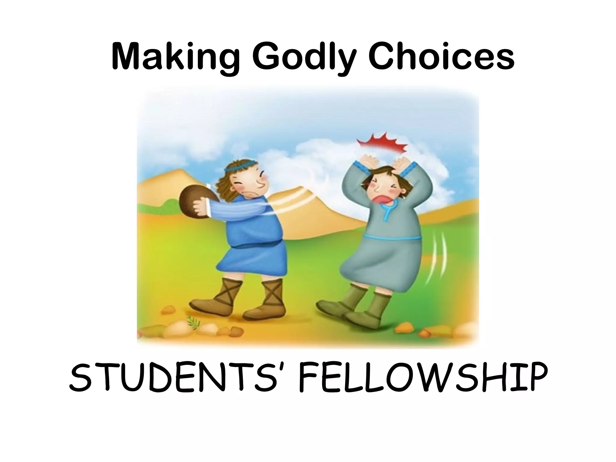 This document outlines the schedule and activities for a students' fellowship event focused on making godly choices. The event includes singing praise and worship songs, listening to readings from the Bible including Exodus 20:15-17 and Genesis 27:1-40, discussing the stories of Job and Jacob, and how to grow one's relationship with God through prayer, reading the Bible, and obedience. The event will conclude with prayer and a game.