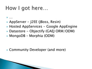 This document provides an overview of MongoDB and the Morphia object-document mapper for Java. It discusses MongoDB concepts like document storage, indexing, and concurrency model. It then covers Morphia's annotations for mapping Java objects to MongoDB documents, including entity configuration, relationships, and common data access patterns using queries and updates. Code examples are provided for mapping object graphs, querying, and updating documents.
