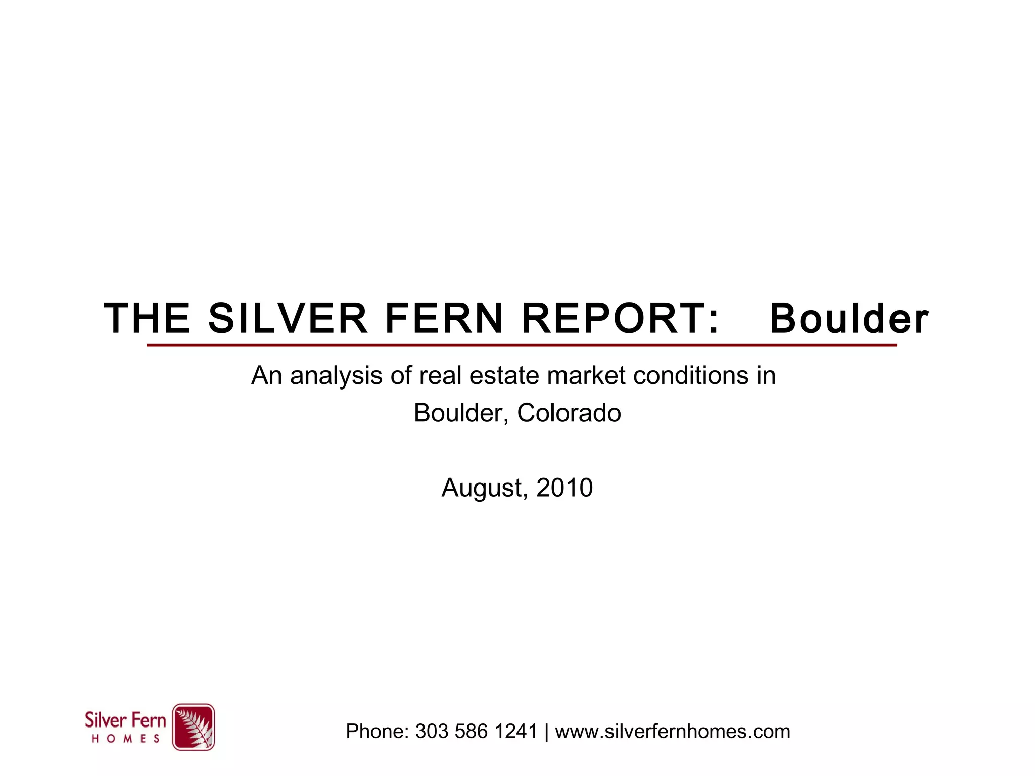 This document is a real estate market analysis report from Silver Fern Homes for Boulder, Colorado in August 2010. It summarizes key housing market metrics including inventory levels, sales volumes, and absorption rates for single-family homes in the city. Inventory levels rose slightly in July but remain well below last year. Sales volumes plummeted nearly 30% compared to July 2009 and absorption rates hit a record low. The report also provides breakdowns of market performance by price ranges, finding the entry-level segment below $400,000 experiencing a dramatic rise in inventory and decline in demand since homebuyer tax credits expired.
