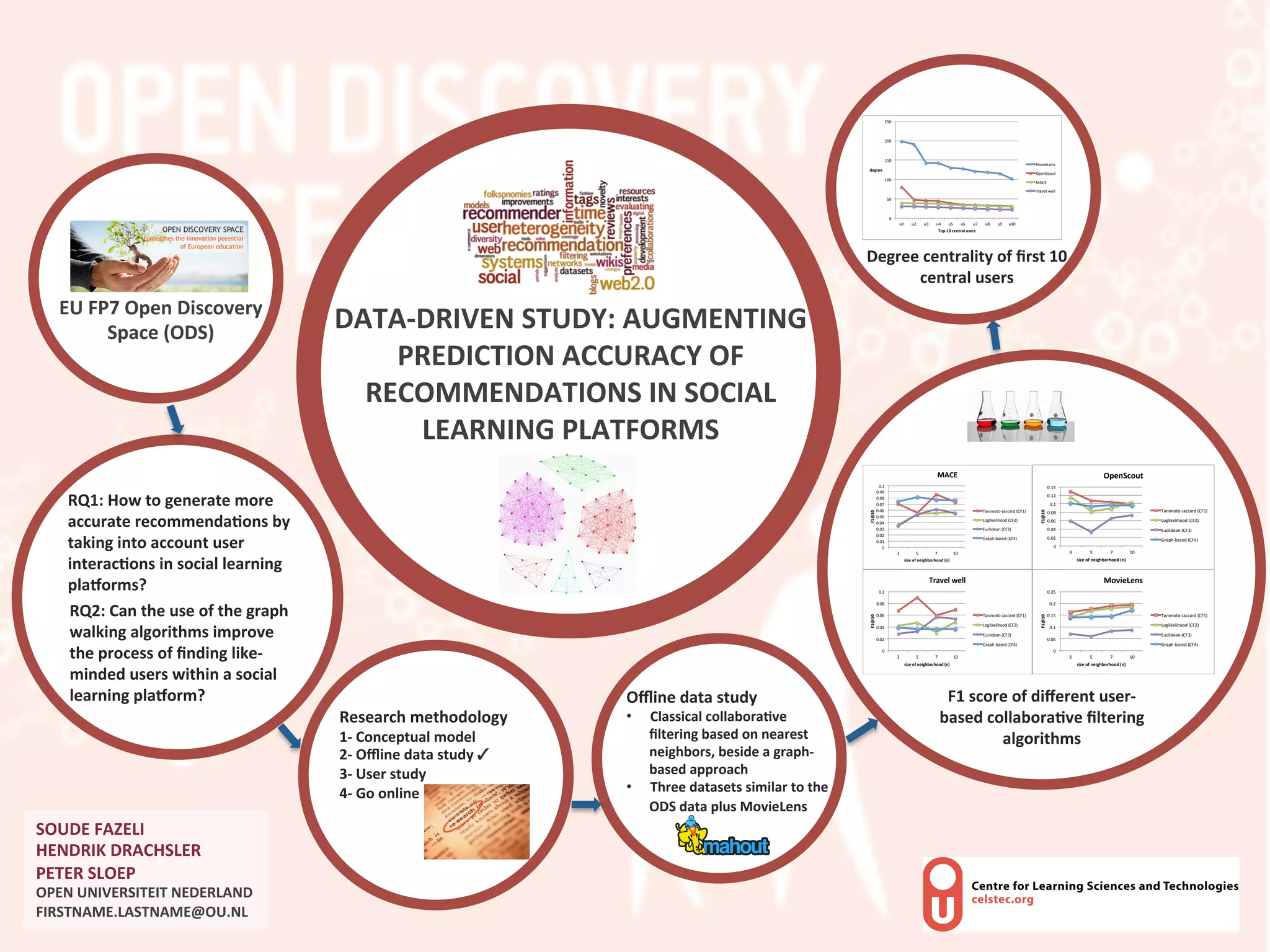 250" 200" 150" MovieLens" degree% OpenScout" 100" MACE" Travel"well" 50" 0" u1" u2" u3" u4" u5" u6" u7" u8" u9" u10" Top)10%central%users% Degree  centrality  of  first  10   central  users   EU  FP7  Open  Discovery   Space  (ODS)   DATA-­‐DRIVEN  STUDY:  AUGMENTING   PREDICTION  ACCURACY  OF   RECOMMENDATIONS  IN  SOCIAL   LEARNING  PLATFORMS   MACE% 0.1" Tanimoto4Jaccard"(CF1)" Loglikelihood"(CF2)" 0.08" Tanimoto3Jaccard"(CF1)" 0.06" Loglikelihood"(CF2)" Euclidean"(CF3)" 0.04" Graph4based"(CF4)" 0.02" Euclidean"(CF3)" Graph3based"(CF4)" 0" 5" 7" 3" 10" 5" 0.2" 0.06" Tanimoto3Jaccard"(CF1)" 0.04" Loglikelihood"(CF2)" Euclidean"(CF3)" Graph3based"(CF4)" 3" 5" 7" 10" size%of%neighborhood%(n)% •  Tanimoto0Jaccard"(CF1)" 0.15" Loglikelihood"(CF2)" 0.1" Euclidean"(CF3)" 0.05" Graph0based"(CF4)" 0" 0" Classical  collaboraHve   filtering  based  on  nearest   neighbors,  beside  a  graph-­‐ based  approach   Three  datasets  similar  to  the   ODS  data  plus  MovieLens   F1@10% F1@10% 0.25" 0.02" •  10" MovieLens% Travel%well% 0.1" 0.08" Offline  data  study   7" size%of%neighborhood%(n)% size%of%neighborhood%(n)% 1-­‐  Conceptual  model   2-­‐  Offline  data  study  ✓   3-­‐  User  study   4-­‐  Go  online   OPEN  UNIVERSITEIT  NEDERLAND   FIRSTNAME.LASTNAME@OU.NL   0.12" 3" Research  methodology   SOUDE  FAZELI   HENDRIK  DRACHSLER   PETER  SLOEP   OpenScout% 0.14" F1@10% F1@10% RQ1:  How  to  generate  more   accurate  recommendaHons  by   taking  into  account  user   interacHons  in  social  learning   pla_orms?   RQ2:  Can  the  use  of  the  graph   walking  algorithms  improve   the  process  of  finding  like-­‐ minded  users  within  a  social   learning  pla_orm?   0.1" 0.09" 0.08" 0.07" 0.06" 0.05" 0.04" 0.03" 0.02" 0.01" 0" 3" 5" 7" 10" size%of%neighborhood%(n)% F1  score  of  different  user-­‐ based  collaboraHve  filtering   algorithms