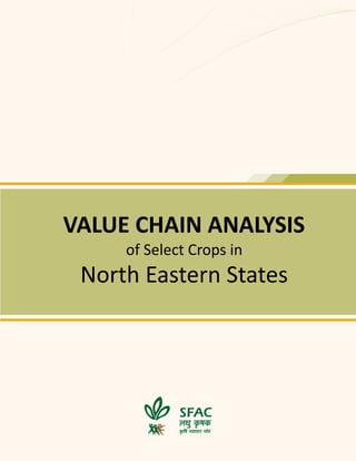 This document provides an overview and methodology for a value chain analysis study of select horticultural crops in the North Eastern region of India. The study aims to map the value chains of six focus crop groups - ginger/turmeric, citrus, pineapple, Naga chilli, vegetables, and other location-specific crops. Both secondary and primary research was conducted, including literature reviews, focus group discussions with farmers and traders, and interviews with stakeholders. The methodology involved identifying production clusters, mapping the movement of crops and price changes from farm to market, and analyzing challenges and opportunities to develop recommendations for strengthening the value chains.