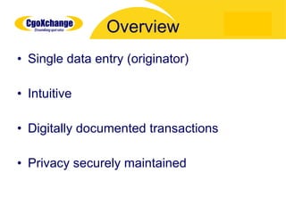 The document introduces a new digital cargo marketplace that allows freight forwarders to securely enter shipment details and invite airlines and trucking companies to bid on the work. It provides a single data entry point, an intuitive interface, and digitally documents all transactions for privacy and security. The system aims to make the bidding process more efficient for all parties involved through features like mobile access and social media integration. It is operated by a Dutch cargo company with 30 years of industry experience.