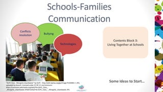 Schools need to create a positive environment for learning by establishing rules together that make all parties comfortable. Tips for living together at school include behaving respectfully, treating difficult situations objectively by assessing the rights of all involved without prejudice. Rules should be formulated collaboratively and positively by proposing performance standards rather than judgments. An active learning approach and open classroom spaces can improve student engagement and reduce conflicts.