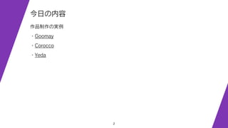 2 今日の内容 作品制作の実例 ・Goomay ・Corocco ・Yeda