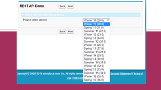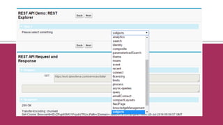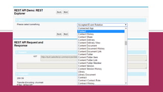 The document provides an overview of the Salesforce REST API, explaining its architecture, principles, and functionalities, including how to interact with Salesforce resources through HTTP methods. It details the REST architectural style, emphasizing the importance of statelessness, caching, uniform interfaces, and the use of friendly URLs to optimize API calls. Additionally, it discusses the differences between REST, SOAP, and Bulk APIs, and outlines how to access available API versions and perform CRUD operations.